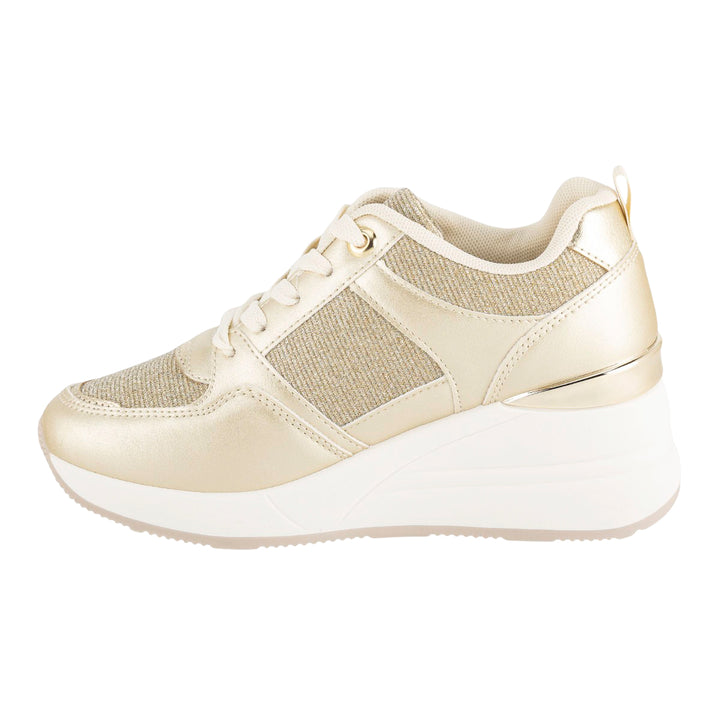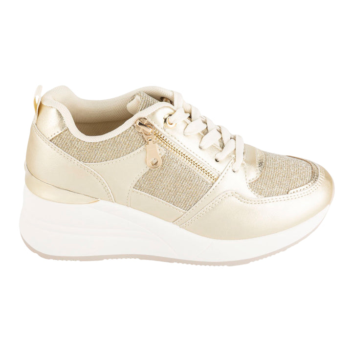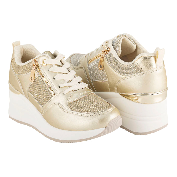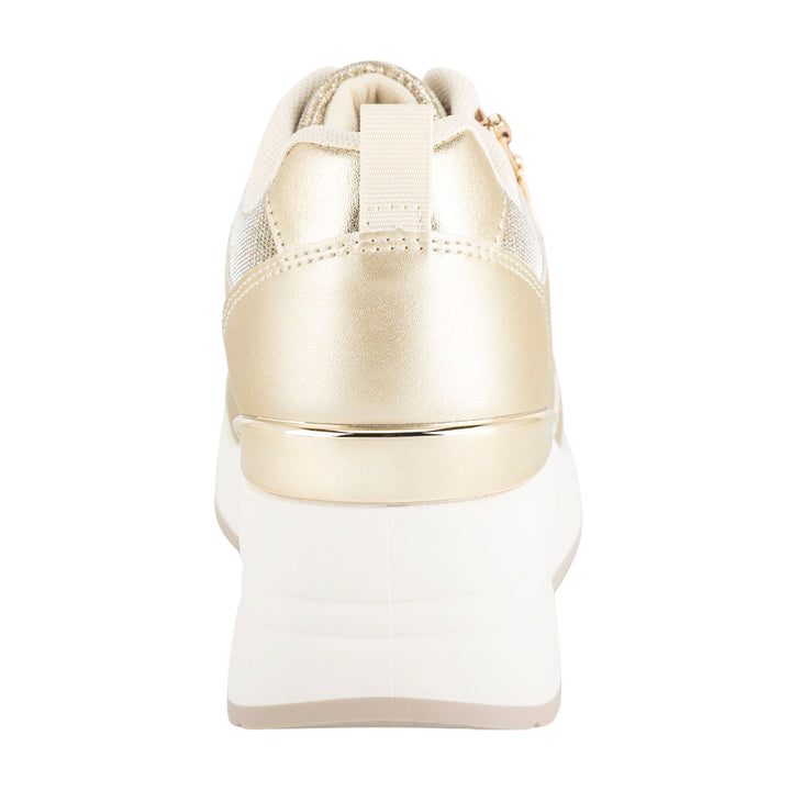 Diseño: Tenis de plataforma con una combinación de texturas metálicas, brillantes y lisas en tonos dorados y beige.