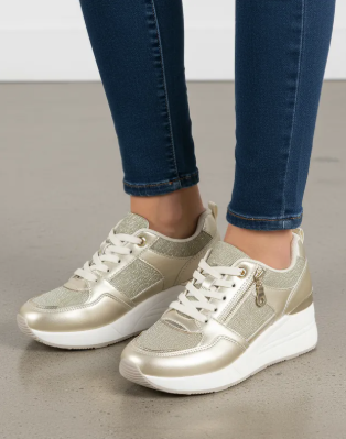 ¡Ven y eleva tu estilo con un toque de brillo y comodidad. Estos tenis de plataforma de la marca 'Perugia' modelo Tenis Urbano Plataforma Dama Perugia A07062!, combinan a la perfección la moda con la funcionalidad. Su diseño en tono dorado y beige, con detalles de purpurina y un práctico cierre de cremallera lateral, los convierte en el calzado ideal para cualquier ocasión casual, ofreciendo un look sofisticado y moderno.