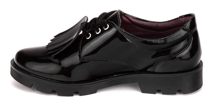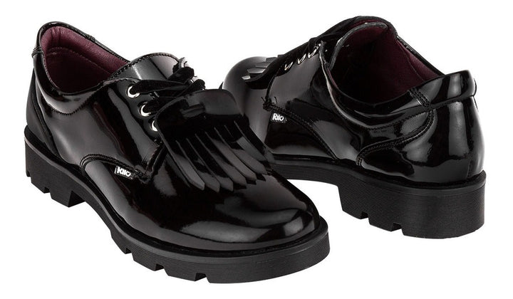Deja que tu pequeña descubra la magia de caminar con comodidad y estilo con el siguiente modelo de Zapato Escolar Casual Vestir Niña Juvenil Moda Charol Rilo. Zapatos para niña escolares de vestir en charol de la marca 'Rilo', tipo blucher, haz que tu pequeña vista a la moda.